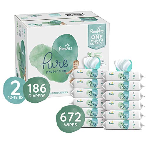 Diapers Size 2, 186 Count and Baby Wipes - Pampers Pure Protection Disposable Baby Diapers, Hypoallergenic and Unscented, ONE MONTH SUPPLY with Pampers Aqua Pure Sensitive Baby Wipes, 672 Count | MommyDeals