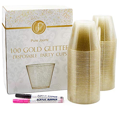48% OFF Pure Journi Fancy Plastic Party Cups, 9 Oz. | 100 Gold Glitter Cups for Wedding Reception, Christmas, Parties | For Wine, Champagne, Appetizer Tumbler, etc. | Includes 2 Marker Pens (Black & Pink) | MommyDeals