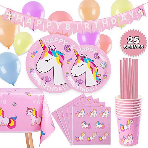 Unicorn Party Supplies Unicorn Birthday Decorations Set Includes Disposable Paper Plates, Cups, Napkins, Straws, Tablecloth, Decorations Balloons, Decorations Bunting, Serves 25, 177PCS | MommyDeals