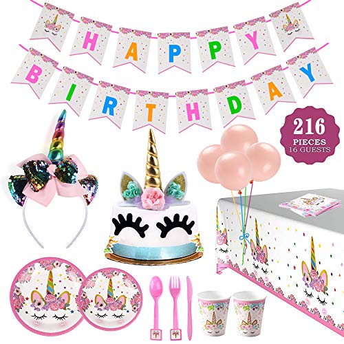 56% OFF Unicorn Theme 216 pcs Birthday Party Supplies Set for Girls, Happy Birthday Banner | Cake Topper | Balloons | Napkins | Plates | Cups | Tableware | Table Cloth - Serves 16 | MommyDeals