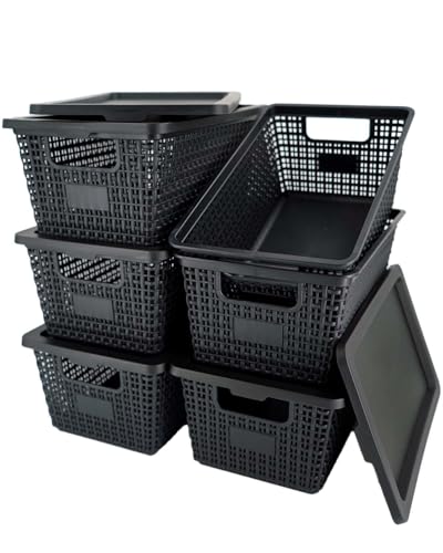Storage Bins with Lids, Set of 6, Black Plastic Containers with Easy Pull Handles and Lids | MommyDeals