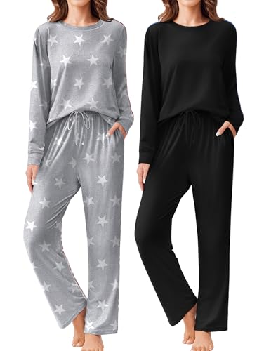 2 Pack Women Pajama Long Sleeve Sleepwear, Soft Loungewear Pjs Sets with Pockets | MommyDeals